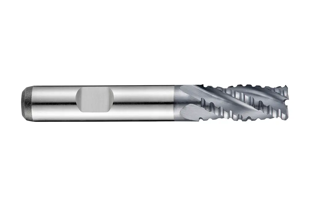 Черновая фреза короткой серии с плоским крупным шагом NF и 4 канавками, диаметром 20 мм с длиной режущей части 38 мм, общей длиной 104 мм и вылетом 53,5 мм с затылком, в соответствии со стандартом DIN 844 K с хвостовиком Weldon 20 мм, из быстрорежущей стали HSS-E на основе кобальта с покрытием TiCN, углом подъема спирали 30° и передним углом 12° для фрезерования уступов, фрезерования пазов и врезания под углом при обработке на станке, из обычной углеродистой и легированной стали, чугуна, меди или медных сплавов