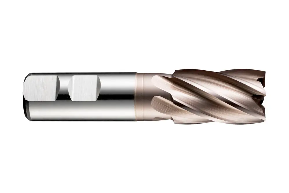 Короткая концевая фреза с 5 канавками, диаметром 25 мм, длиной резания 45 мм, общей длиной 121 мм и вылетом 64,5 мм с зачисткой шейки, в соответствии со стандартом DIN 844 K, с хвостовиком Weldon 25 мм, порошковая металлургическая быстрорежущая сталь HSS-E с покрытием TiCN, угол наклона спирали 30° и угол заточки 12°, для фрезерования плеч, пазов и обработки наклонных поверхностей при свободной обработке, для низкоуглеродистой и легированной стали, чугуна, меди или медных сплавов, а также титана или титановых сплавов.