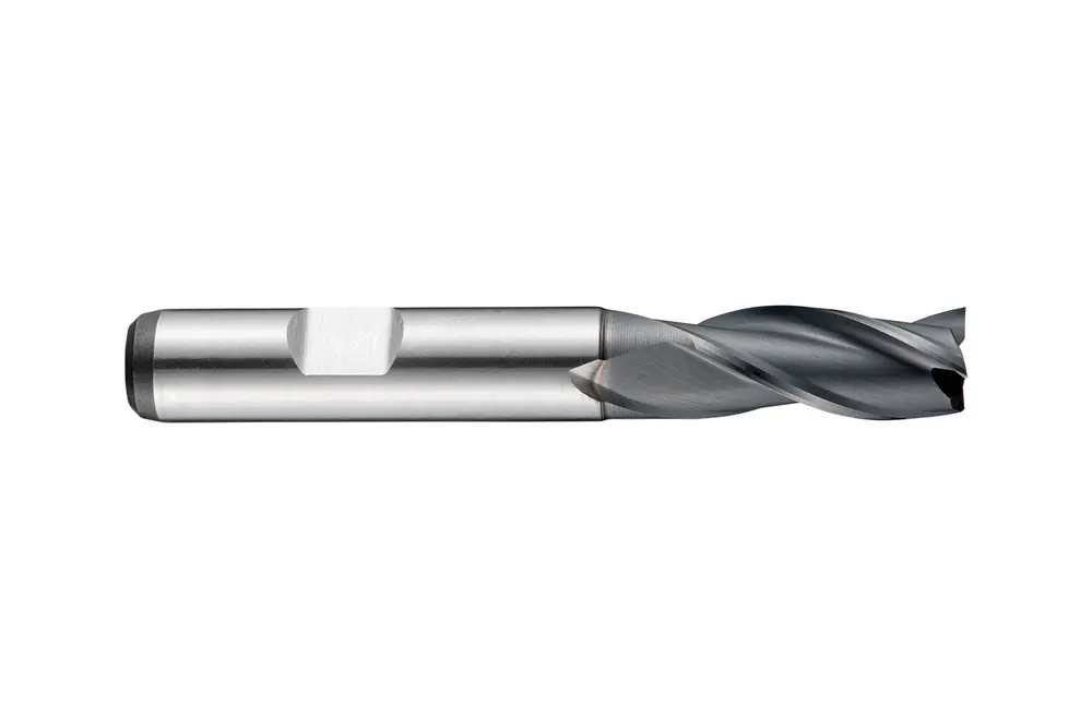 Короткое шлицевое сверло с 3 канавками, диаметром 12 мм с длиной режущей части 26 мм, общей длиной 83 мм и вылетом 37,5 мм с затылком, в соответствии со стандартом DIN 844 K с хвостовиком Weldon 12 мм, порошковая металлургическая HSS-E с покрытием Alcrona, углом наклона спирали 30° и передним углом 12° для фрезерования уступов, фрезерования пазов и обработки под углом в стали и стальном литье, чугуне, меди или медных сплавах, а также титане или титановых сплавах.