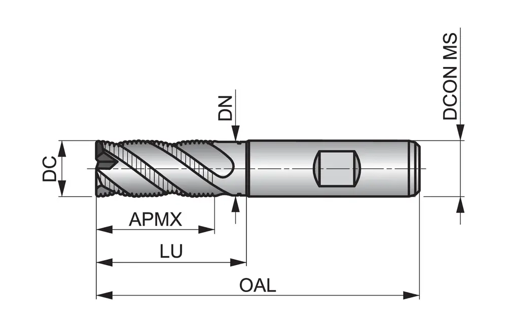 Черновая фреза короткой серии с асимметричным крупным шагом NRA и 4 канавками, диаметром 13 мм с длиной режущей части 26 мм, общей длиной 83 мм и вылетом 37,5 мм с затылком, в соответствии со стандартом DIN 844 K с хвостовиком Weldon 12 мм, порошковая металлургическая HSS-E с блестящей отделкой, углом подъема спирали 35° и передним углом 12° для фрезерования уступов, фрезерования пазов и врезания под углом в стали и стальном литье, ферритной, мартенситной и супераустенитной, дуплексной или дисперсионно-твердеющей нержавеющей стали, чугуна, меди или медных сплавов и жаропрочных сплавов