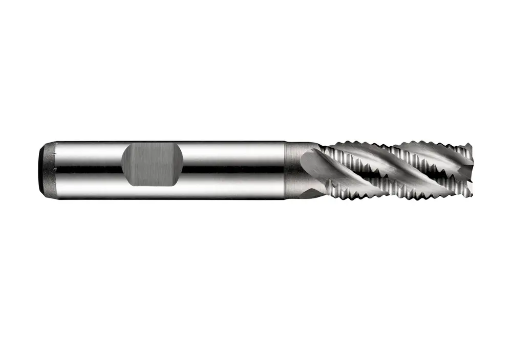Черновая фреза короткой серии с асимметричным крупным шагом NRA и 4 канавками, диаметром 7 мм с длиной режущей части 16 мм и общей длиной 66 мм, в соответствии со стандартом DIN 844 K с хвостовиком Weldon 10 мм, порошковая металлургическая HSS-E с блестящей отделкой, углом подъема спирали 35° и передним углом 12° для фрезерования уступов, фрезерования пазов и обработки под углом в стали и литой стали, ферритной, мартенситной и супераустенитной, дуплексной или дисперсионно-твердеющей нержавеющей стали, чугуна, меди или медных сплавов и жаропрочных сплавов