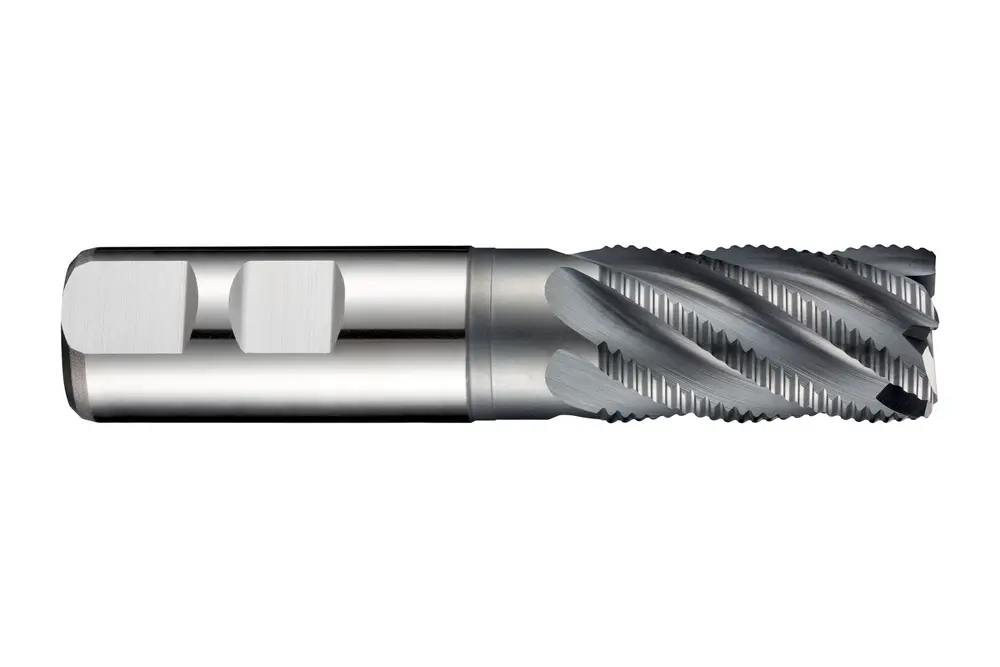 Черновая фреза короткой серии с асимметричным мелкошаговым профилем HRA и 6 канавками, диаметром 28 мм с длиной режущей части 45 мм, общей длиной 121 мм и вылетом 64,5 мм с затылком, в соответствии со стандартом DIN 844 K с хвостовиком Weldon 25 мм, порошковая металлургическая HSS-E с покрытием Alcrona, углом подъема спирали 35° и передним углом 12° для фрезерования уступов, фрезерования пазов и обработки под углом в легированной и инструментальной стали, нержавеющей стали, чугуне, меди или медных сплавах, а также жаропрочных сплавах.