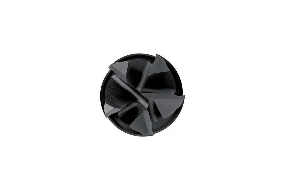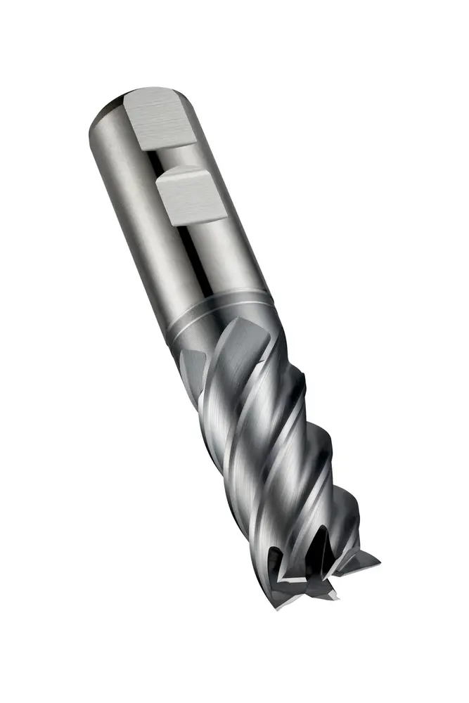 Короткая концевая фреза с 5 канавками, диаметром 25 мм, длиной резания 45 мм, общей длиной 121 мм и вылетом 64,5 мм с зачисткой шейки, в соответствии со стандартом DIN 844 K, с хвостовиком Weldon 25 мм, порошковая металлургическая быстрорежущая сталь HSS-E с покрытием Alcrona, угол наклона спирали 45° и угол заточки 12°, для фрезерования плеч, пазов и обработки наклонных поверхностей в углеродистой, легированной и инструментальной стали, нержавеющей стали, чугуне, меди или медных сплавах и высокотемпературных сплавах.