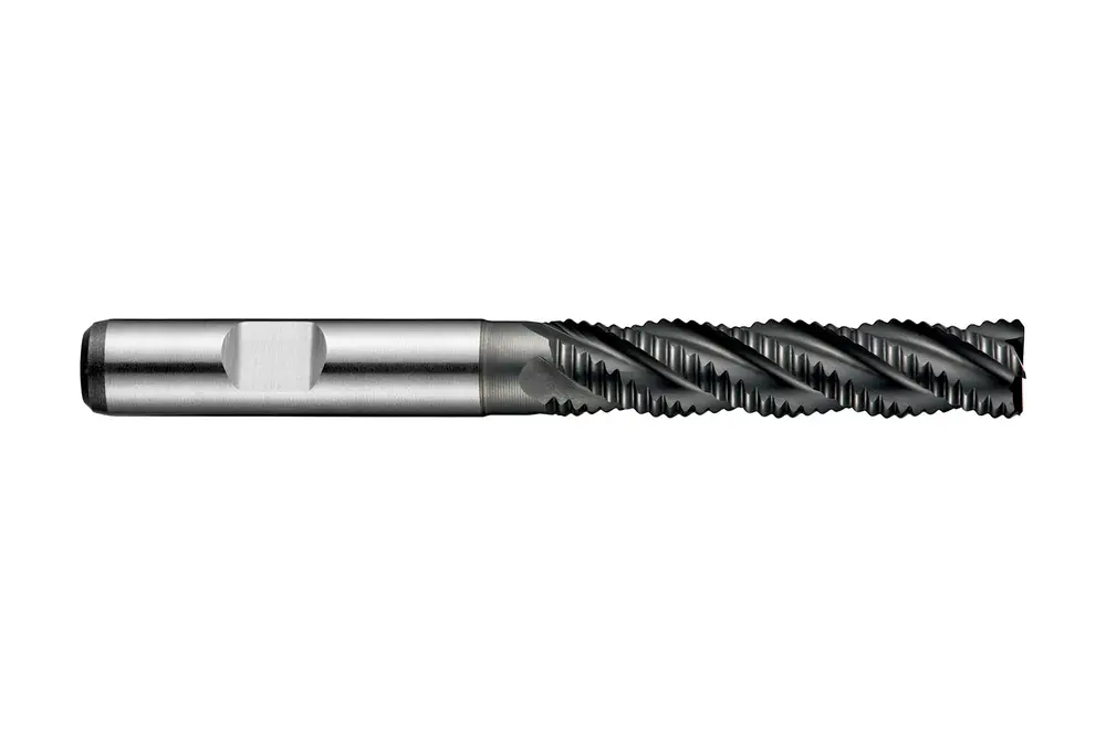 Длинная серия черновых концевых фрез с асимметричным крупным шагом NRA и 4 канавками, диаметром 12 мм с длиной режущей части 53 мм, общей длиной 110 мм и вылетом 64,5 мм с затылком, в соответствии со стандартом DIN 844 L с хвостовиком Weldon 12 мм, порошковая металлургическая HSS-E с покрытием Alcrona, углом подъема спирали 35° и передним углом 12° для фрезерования уступов и пазов в обычной углеродистой, легированной и инструментальной стали, нержавеющей стали, чугуне, меди или медных сплавах, а также жаропрочных сплавах.