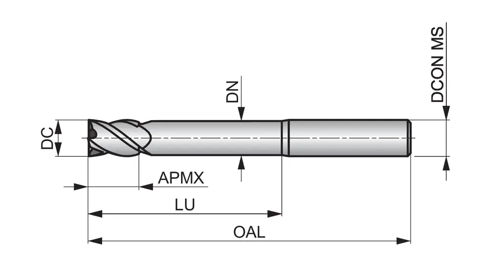 Сверхкороткая концевая фреза с 4 канавками, диаметром 16 мм, длиной резания 22 мм, общей длиной 125 мм и вылетом 85 мм с зачисткой шейки, в соответствии со стандартом Dormer Pramet, с гладким хвостовиком 16 мм, из твердого сплава с покрытием AlTiN, углом спирали 40° и углом заточки 3°, для фрезерования и врезания в мартенситные, аустенитные и супераустенитные, дуплексные или дисперсионно-упрочняемые нержавеющие стали и высокотемпературные сплавы.