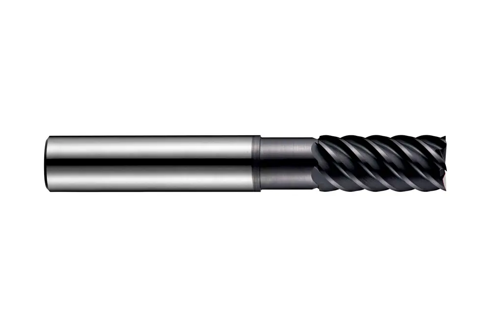 Концевая фреза для чистовой обработки короткой серии с 8 канавками, диаметром 18 мм, длиной режущей части 35 мм, общей длиной 100 мм и вылетом 53 мм с затылком, в соответствии со стандартом Dormer Pramet, с цилиндрическим хвостовиком 18 мм, цельная твердосплавная с покрытием AlTiN, углом наклона спирали 50° и передним углом 3° для фрезерования уступов в мартенситных, аустенитных и супераустенитных, дуплексных или дисперсионно-твердеющих нержавеющих сталях и жаропрочных сплавах.