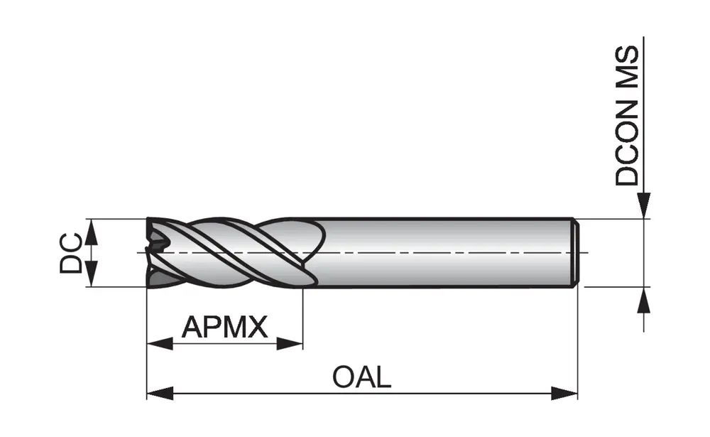 Короткая концевая фреза с 4 канавками, диаметром 12 мм, длиной резания 26 мм и общей длиной 83 мм, по стандарту Dormer Pramet, с гладким хвостовиком 12 мм, из твердого сплава с покрытием AlCrN, спиралью 40° с дифференциальным шагом и углом заточки 4°, предназначенная для фрезерования и врезания в мартенситные, аустенитные и супераустенитные, дуплексные или дисперсионно-упрочняемые нержавеющие стали, высокотемпературные сплавы, закаленный чугун и закаленную сталь <55HRC.
