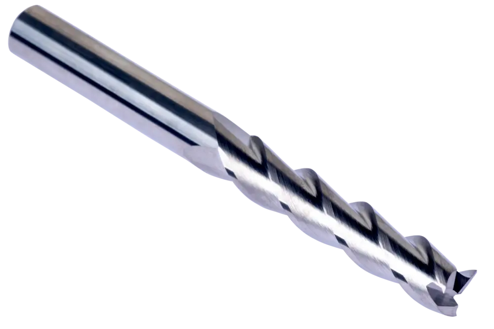 Концевая фреза сверхдлинной серии с 3 канавками, диаметром 16 мм, длиной режущей части 57 мм и общей длиной 125 мм, в соответствии со стандартом Dormer Pramet, с цилиндрическим хвостовиком 16 мм, цельная твердосплавная с блестящей отделкой, углом наклона спирали 40° и передним углом 13° для фрезерования уступов в цветных металлах.