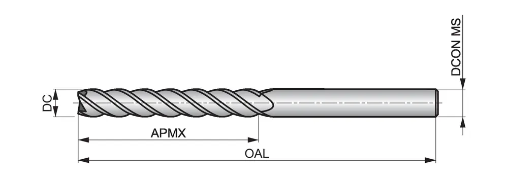 Удлинённая концевая фреза серии с 4 канавками, диаметром 12 мм, длиной резания 75 мм и общей длиной 150 мм, в соответствии со стандартом Dormer Pramet, с гладким хвостовиком 12 мм, из цельного твердосплава с покрытием AlCrN, углом наклона спирали 40° и углом заточки 10°, предназначена для фрезерования плечевых поверхностей в стали и литой стали, ферритной, мартенситной и аустенитной нержавеющей стали, чугуне и высокотемпературных сплавах.