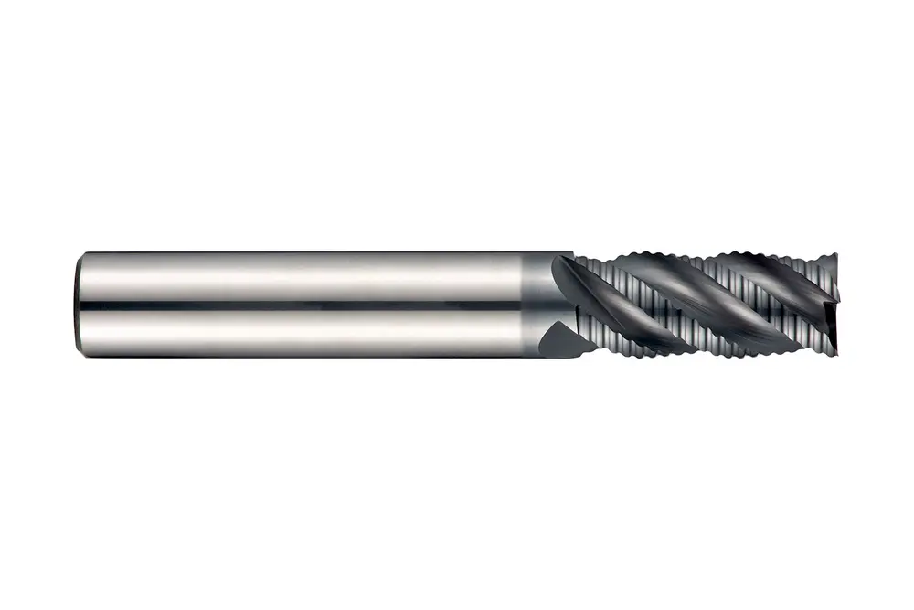 Черновая концевая фреза короткой серии с профилем NR с обычным крупным шагом и 4 канавками, диаметром 16 мм, длиной режущей части 32 мм, общей длиной 90 мм и скошенными под углом 45° 0,3 мм угловыми кромками, в соответствии со стандартом Dormer Pramet, с гладким хвостовиком 16 мм, цельная твердосплавная с покрытием AlCrN, углом спирали 40° с неравномерным шагом и передним углом 10° для фрезерования уступов в стали и стальном литье, ферритной, мартенситной и аустенитной нержавеющей стали, чугуне и жаропрочных сплавах