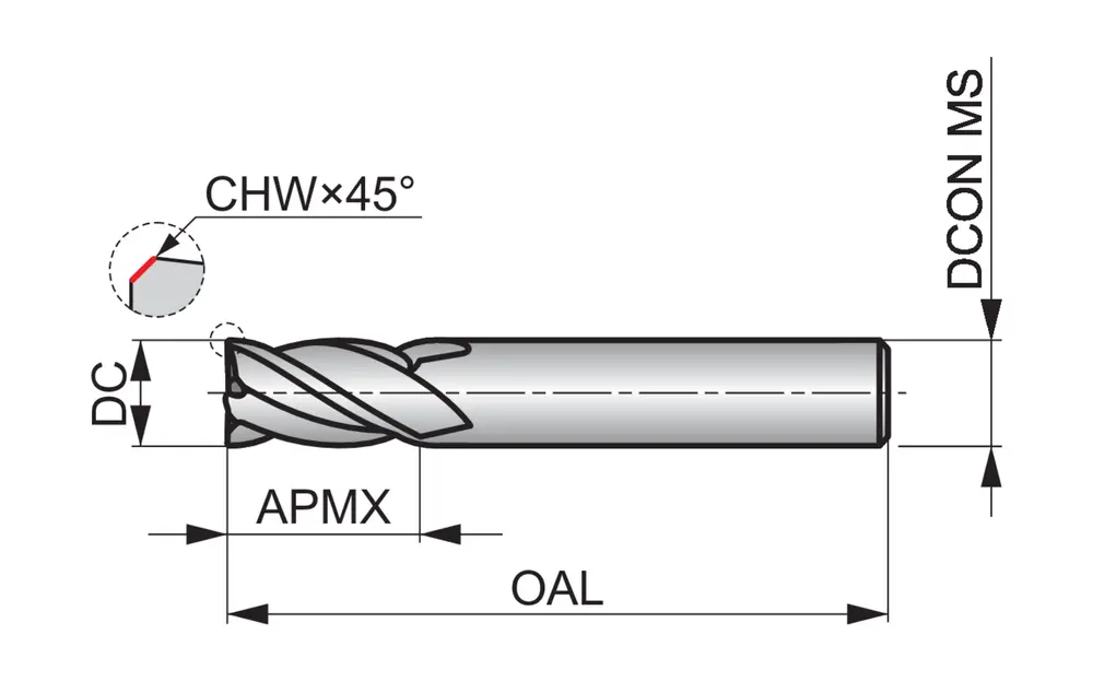 Сверхкороткая концевая фреза с 4 канавками, диаметром 10 мм, длиной резания 14 мм, общей длиной 66 мм и скошенными под углом 45° кромками толщиной 0,2 мм, в соответствии со стандартом DIN 6527 K, с гладким хвостовиком 10 мм, из твердого сплава с покрытием AlCrN, углом спирали 34° и углом заточки 9°, предназначена для фрезерования и врезания в сталь и литую сталь, ферритные, мартенситные и аустенитные нержавеющие стали, чугун и медь или медные сплавы.