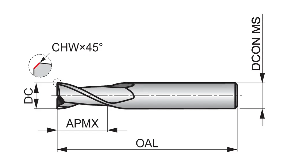 Короткое шлицевое сверло с 2 канавками, диаметром 6 мм с длиной режущей части 10 мм, общей длиной 57 мм и скошенными под углом 45° 0,13 мм углами, в соответствии со стандартом DIN 6527 L с цилиндрическим хвостовиком 6 мм, цельный твердосплавный с покрытием AlCrN, углом подъема спирали 28° и передним углом 9° для фрезерования пазов и обработки под углом в стали и литой стали, нержавеющей стали, чугуне, кованых деталях, литом алюминии и меди или медных сплавах, а также жаропрочных сплавах.