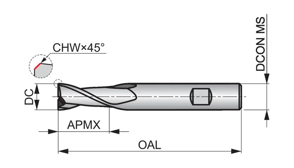 Короткое шлицевое сверло с 2 канавками, диаметром 3 мм с длиной режущей части 7 мм, общей длиной 57 мм и скошенными под углом 45° 0,08 мм углами, в соответствии со стандартом DIN 6527 L с хвостовиком Weldon 6 мм, цельное твердосплавное с покрытием AlCrN, углом подъема спирали 28° и передним углом 9° для фрезерования пазов и обработки наклонных поверхностей в стали и литой стали, нержавеющей стали, чугуне, кованых деталях, литом алюминии и меди или медных сплавах, а также жаропрочных сплавах.