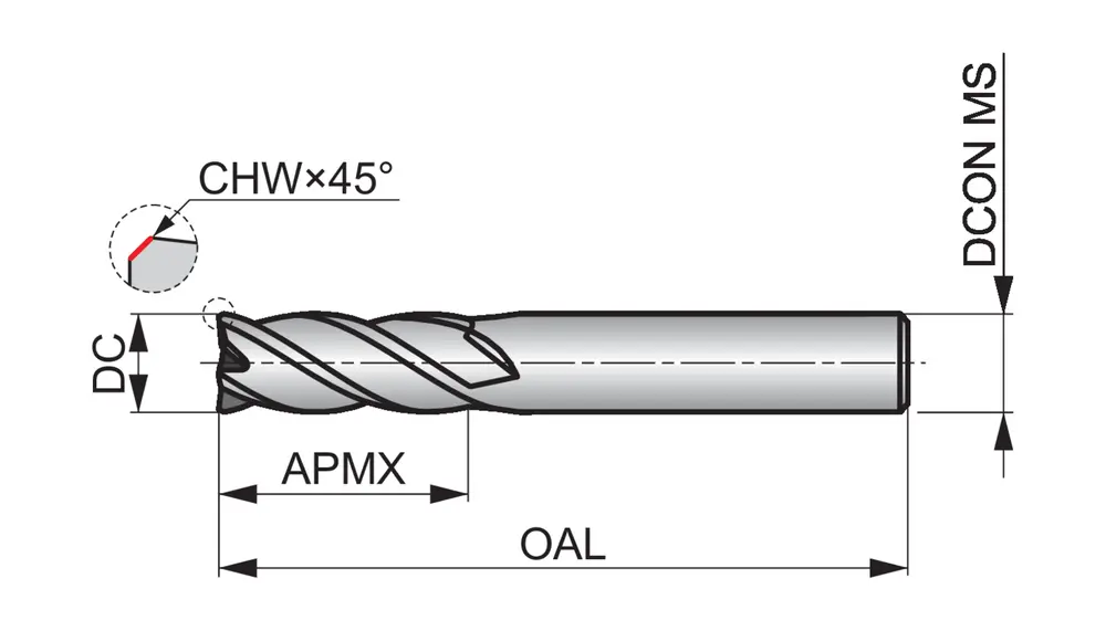 Короткая концевая фреза с 4 канавками, диаметром 16 мм, длиной резания 32 мм, общей длиной 92 мм и скошенными под углом 45° кромками толщиной 0,2 мм, в соответствии со стандартом DIN 6527 L, с гладким хвостовиком 16 мм, из твердого сплава с покрытием AlCrN, углом спирали 34° и углом заточки 9°, предназначена для фрезерования и врезания в сталь и литую сталь, ферритную и мартенситную нержавеющую сталь, чугун и медь или медные сплавы.