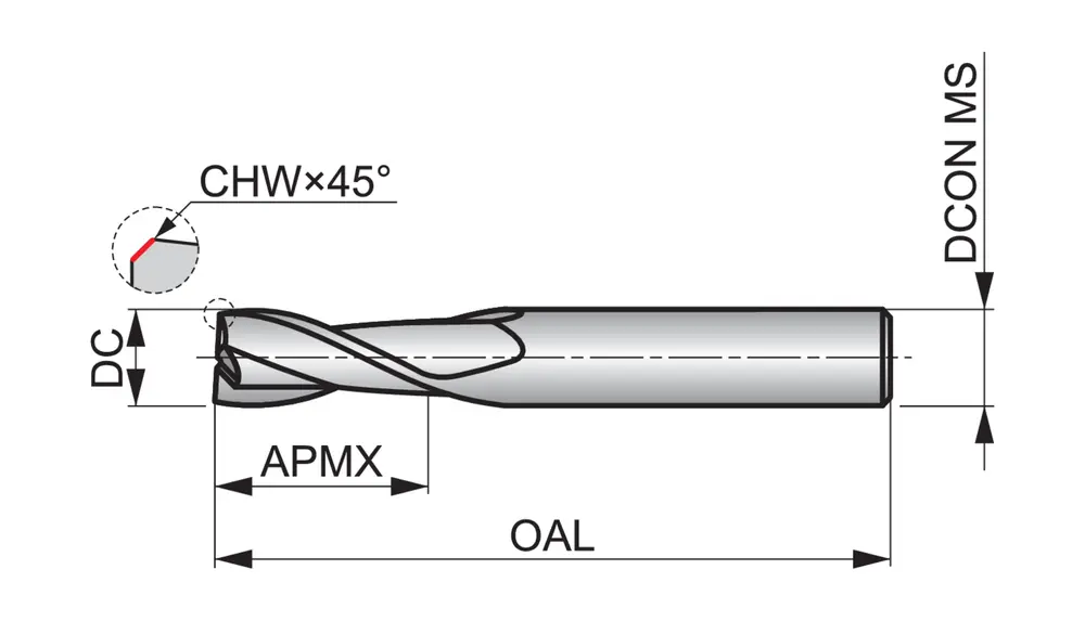 Фреза для пазов стандартной длины с 2 канавками, диаметром 3 мм с длиной режущей части 12 мм, общей длиной 57 мм и скошенными под углом 45° 0,08 мм угловыми кромками, в соответствии со стандартом Dormer Pramet, с гладким хвостовиком 6 мм, цельный твердосплавный с покрытием AlCrN, углом подъема спирали 28° и передним углом 9° для фрезерования пазов и обработки наклонных поверхностей в стали и литой стали, нержавеющей стали, чугуне, кованых деталях, литом алюминии и меди или медных сплавах, а также жаропрочных сплавах.