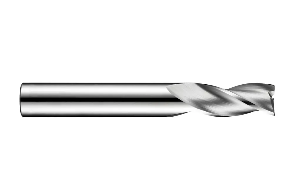 Концевая фреза стандартной длины с 3 канавками, диаметром 3 мм, длиной режущей части 12 мм, общей длиной 38 мм и скошенными под углом 45° кромками 0,08 мм, в соответствии со стандартом Dormer Pramet, с гладким хвостовиком 3 мм, цельный твердосплавный с блестящей отделкой, углом подъема спирали 30° и передним углом 12° для фрезерования уступов и пазов при автоматической обработке на станке, обычной углеродистой и легированной стали, ковкого, пластичного и вермикулярного чугуна, а также меди или медных сплавов.