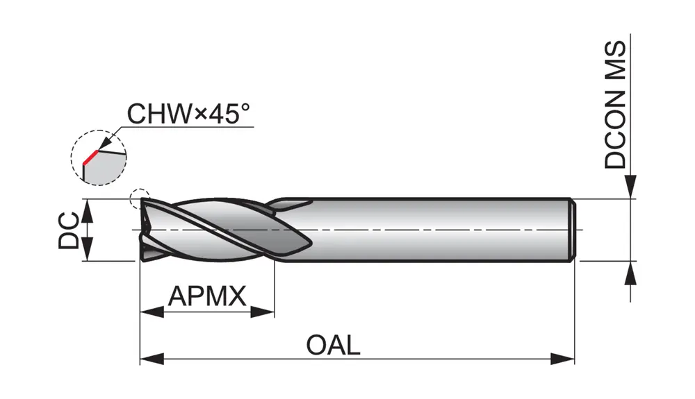 Стандартная концевая фреза с 4 канавками, диаметром 16 мм, длиной резания 32 мм, общей длиной 92 мм и скошенными под углом 45° кромками толщиной 0,2 мм, в соответствии со стандартом Dormer Pramet, с гладким хвостовиком 16 мм, из цельного твердосплава с полированной поверхностью, углом спирали 30° и углом заточки 12°, предназначенная для фрезерования плечевых поверхностей в легкообрабатываемых материалах, для углеродистой и легированной стали, ковкого, высокопрочного и компактного графитового чугуна, меди или медных сплавов.