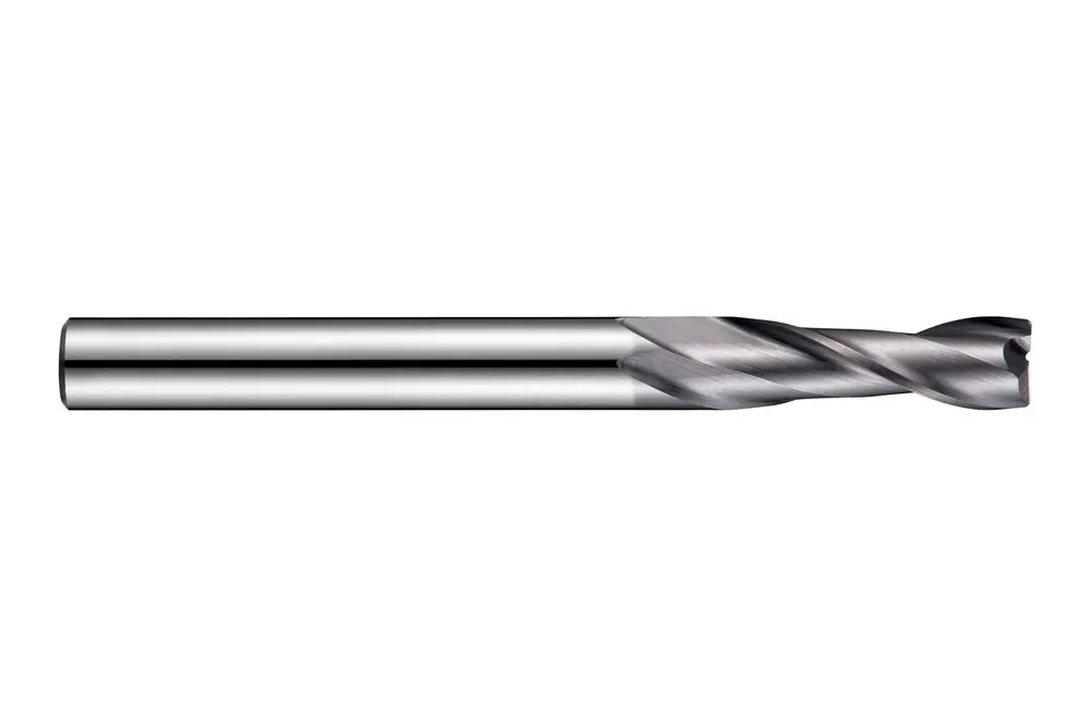 Концевая фреза стандартной длины с 2 канавками, диаметром 3 мм, длиной режущей части 12 мм, общей длиной 38 мм и скошенными под углом 45° 0,08 мм угловыми кромками, в соответствии со стандартом Dormer Pramet, с хвостовиком Weldon 3 мм, цельнотвердосплавная с покрытием TiAlN, углом подъема спирали 30° и передним углом 12° для фрезерования пазов в стали и стальном литье, чугуне и алюминиевом литье, а также меди или медных сплавах.