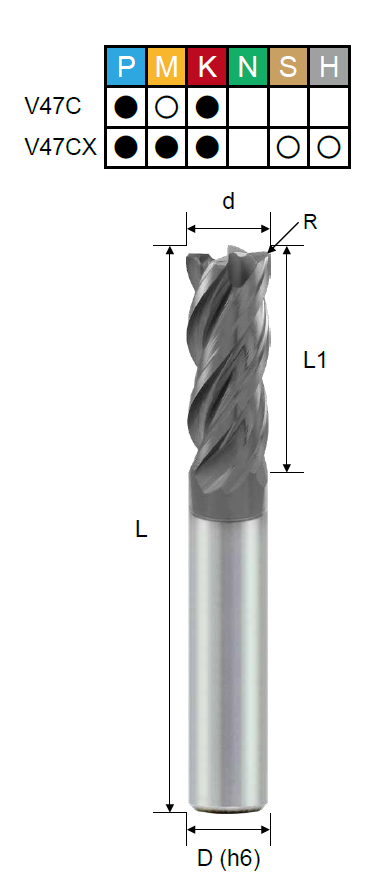 H (твердые материалы), K (чугун), M (нержавеющая сталь), P (сталь), S (титан) |
