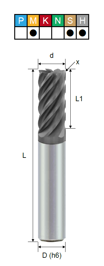 H (твердые материалы), M (нержавеющая сталь), S (титан) |