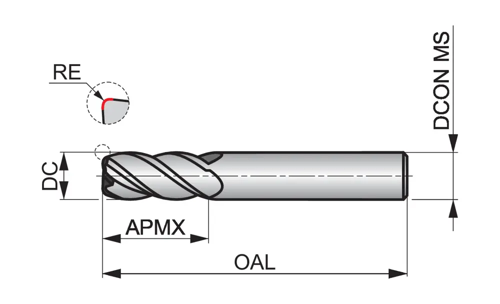 Короткая серия концевых фрез с закругленными углами, 4 канавками, диаметром 5 мм, длиной резания 15 мм, общей длиной 50 мм и закруглением углов 0,5 мм, по стандарту Dormer Pramet, с гладким хвостовиком 5 мм, из твердого сплава с покрытием TiSiN, спиральным углом 40° и углом заточки -6°, предназначена для фрезерования плеч, врезания, прогрессивного врезания, наклонного и спирального фрезерования закаленных материалов.