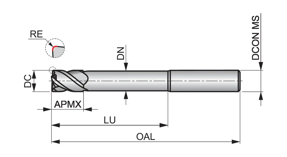 Сверхкороткая серия концевых фрез с закругленными углами, 4 канавки, диаметр 8 мм, длина резания 12 мм, общая длина 75 мм, вылет 40 мм с закруглением шейки и радиус закругления 0,5 мм, в соответствии со стандартом Dormer Pramet, с гладким хвостовиком 8 мм, из твердого сплава с покрытием TiSiN, спиральным углом 40° и углом заточки -6°, для фрезерования плеч, врезания, прогрессивного врезания, наклонного и спирального фрезерования в закаленных материалах.