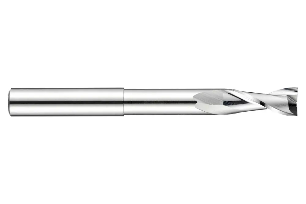 Короткая серия концевых фрез с 2 канавками, диаметром 10 мм, длиной режущей части 22 мм, общей длиной 100 мм, вылетом 60 мм с затылком и радиусом скругления углов 0,1 мм, в соответствии со стандартом Dormer Pramet, с гладким хвостовиком 10 мм, цельный твердосплавный с полированной отделкой, углом спирали 30° и передним углом 20° для фрезерования уступов, фрезерования пазов, обработки наклонных поверхностей и винтового фрезерования в цветных металлах.
