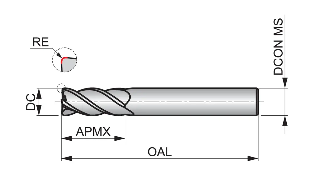 Короткая серия концевых фрез с закругленными углами, 4 канавками, диаметром 6 мм, длиной резания 16 мм, общей длиной 57 мм и закруглением углов 0,5 мм, по стандарту Dormer Pramet, с гладким хвостовиком 6 мм, из цельного твердосплава с полированной поверхностью, углом спирали 40° и углом заточки 10°, для фрезерования плечевых поверхностей, врезания, наклона и спирального фрезерования в цветных металлах.