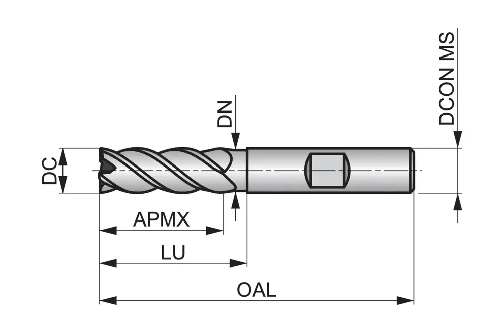 Стандартная концевая фреза с 4 канавками, диаметром 14 мм, длиной резания 26 мм, общей длиной 83 мм, вылетом 37 мм с закруглением шейки и радиусом скругления 0,2 мм, по стандарту Dormer Pramet, с хвостовиком Weldon 14 мм, из цельного твердосплава с покрытием AlCrN, углом спирали 40° и углом заточки 7°, для фрезерования плечевых поверхностей в стали и литой стали, нержавеющей стали, чугуне или высокотемпературных сплавах.