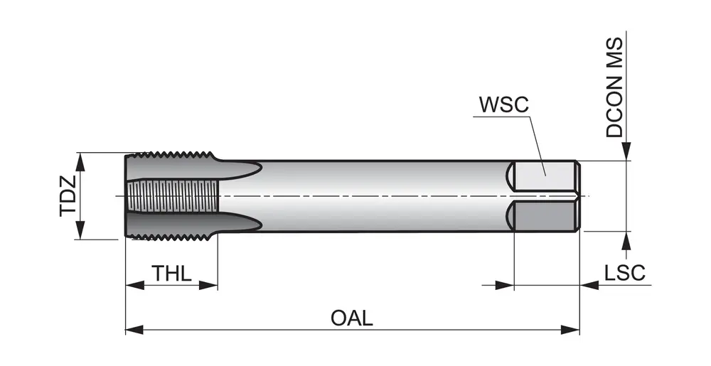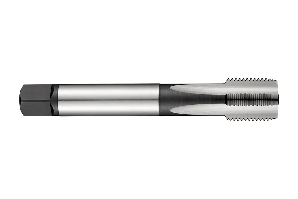 Метчик с прямой канавкой и фаской формы C, с шагом 2-3xP, для трубной резьбы G 3/8" по британскому стандарту с шагом 19 нитей на дюйм и классом точности Normal, размеры по стандарту DIN 5156, с хвостовиком 12,0 мм и квадратным приводом 9,0 мм, из порошковой металлургии HSS-E с блестящей отделкой для нарезания резьбы 1,5xD в сквозных или глухих отверстиях в стали с автоматической и обычной обработкой резанием.