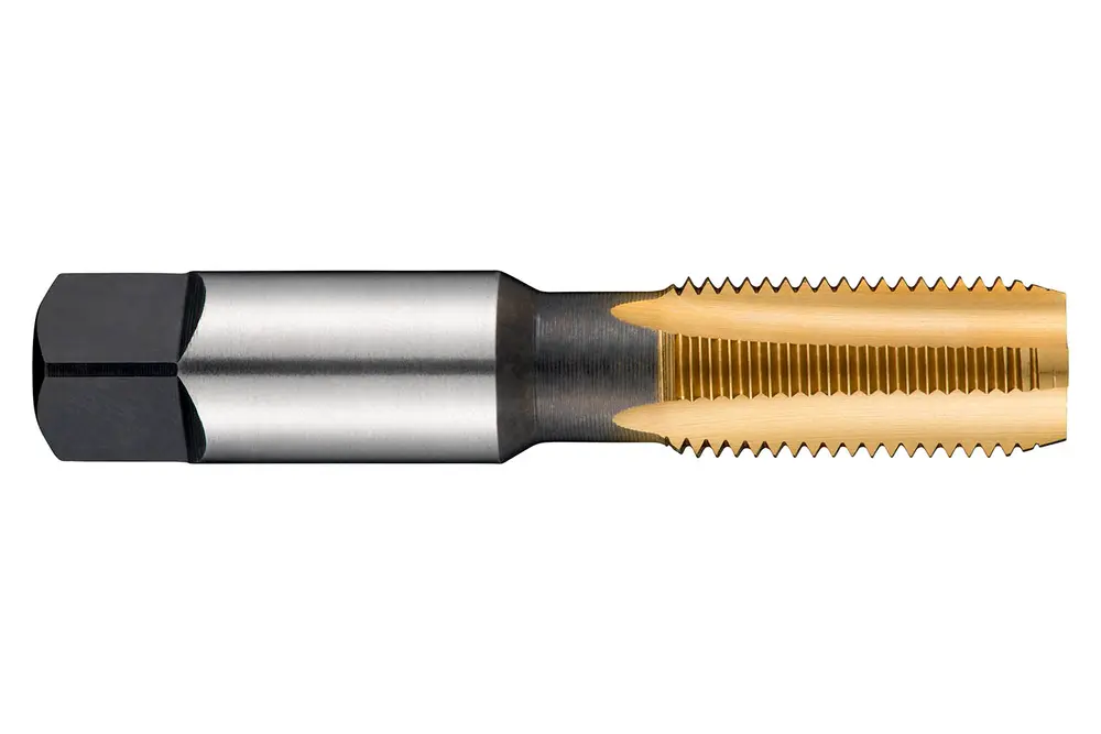 Метчик с прямой канавкой №3 с выводом заглушки 2-3xP, для национальной трубной цилиндрической резьбы (Dryseal) для топливопроводов NPSF 1/4" с 18 TPI и нормальным классом посадки, размеры соответствуют стандарту ~ANSI B94.9 с хвостовиком 14,3 мм и квадратным приводом 10,7 мм, из быстрорежущей стали с покрытием TiN для сквозных или глухих отверстий 1,5xD в легированной стали, чугуне, меди или медных сплавах.