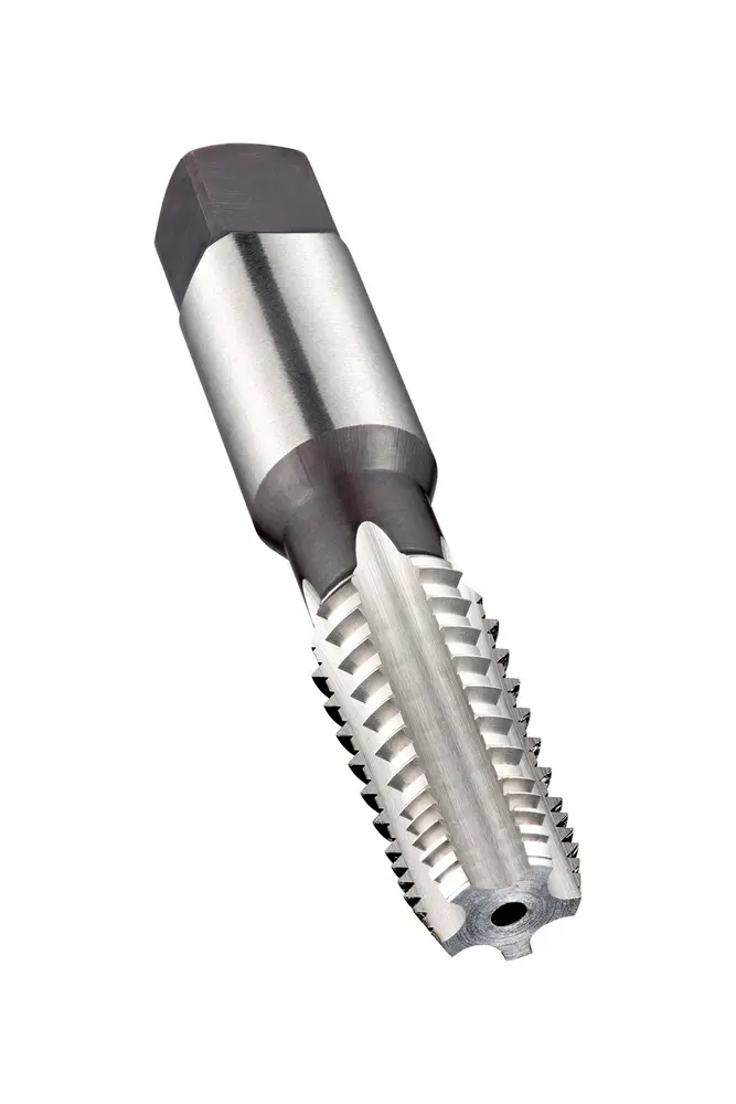 Метчик с прямой канавкой и фаской формы C, с шлицем 2-3xP, для национальной трубной конической резьбы NPT 3/8" с шагом 18 витков на дюйм и нормальным классом точности, размеры соответствуют стандарту ANSI B94.9, с хвостовиком 17,8 мм и квадратным приводом 13,5 мм, из быстрорежущей стали с блестящей отделкой для сквозных или глухих отверстий диаметром 1,5xD в легированной стали.
