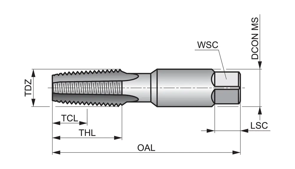 Метчик с прямой канавкой и фаской формы C, с шлицем 2-3xP, для национальной трубной конической резьбы NPT 1/8" с шагом 27 витков на дюйм и нормальным классом точности, размеры соответствуют стандарту ANSI B94.9, с хвостовиком 11,1 мм и квадратным приводом 8,3 мм, из быстрорежущей стали с покрытием TiN для нарезания резьбы 1,5xD в сквозных или глухих отверстиях в стали, чугуне, меди или медных сплавах, подвергаемых автоматической механической обработке.