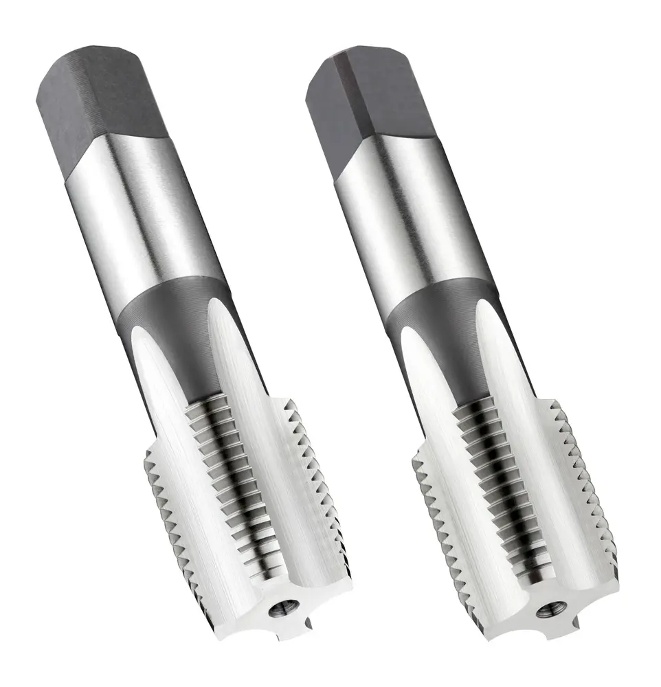 Набор ручных метчиков с прямой канавкой №7 для трубной резьбы G 3/4" по британскому стандарту с шагом резьбы 14 нитей на дюйм и классом точности "нормальный", состоящий из 1 метчика с шагом резьбы 4-6xP и 1 метчика с шагом резьбы 2-3xP, размеры соответствуют стандарту ISO 2284 с хвостовиком 20,0 мм и квадратным приводом 16,0 мм, из быстрорежущей стали с блестящей поверхностью для нарезания резьбы 1,5xD в сквозных или глухих отверстиях в станках с ЧПУ и обычной углеродистой стали.