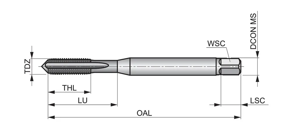 Метчик с прямой канавкой и фаской формы C, с шагом 2-3xP, для унифицированной национальной крупной резьбы UNC 4 с шагом 40 витков на дюйм и классом точности 2B, размеры по стандарту DIN 371, с хвостовиком 3,5 мм и приводным квадратом 2,7 мм, из порошковой металлургической быстрорежущей стали HSS-E с блестящей поверхностью для нарезания сквозной или глухой резьбы 1,5xD в углеродистой стали с автоматической и обычной обработкой резанием