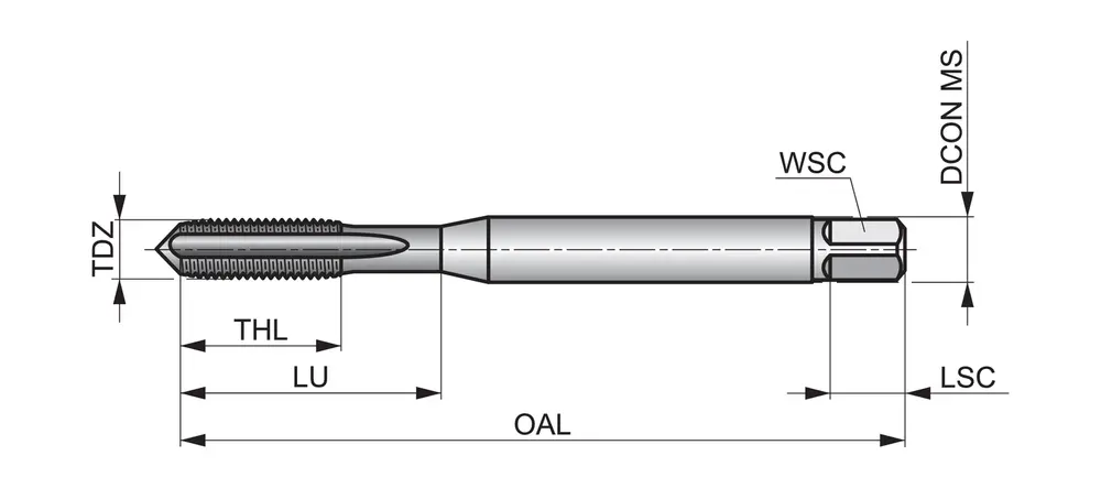 Метчик с прямой канавкой и фаской формы C, с шагом 2-3xP, для унифицированной национальной мелкой резьбы UNF 10 с шагом 32 витка на дюйм и классом точности 2B, размеры по стандарту DIN 371, с хвостовиком 6,0 мм и квадратным приводом 4,9 мм, из порошковой металлургической быстрорежущей стали HSS-E с блестящей поверхностью для нарезания сквозной или глухой резьбы 1,5xD в углеродистой стали с автоматической и обычной обработкой резанием