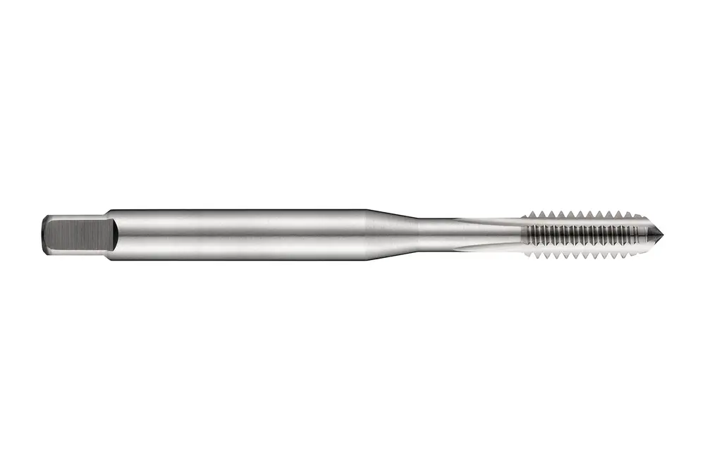 Метчик с прямой канавкой и фаской формы C, с шагом шлица 2-3xP, для унифицированной национальной мелкой резьбы UNF 8 с шагом 36 витков на дюйм и классом точности 2B, размеры по стандарту DIN 371, с хвостовиком 4,5 мм и квадратным приводом 3,4 мм, из порошковой металлургической быстрорежущей стали HSS-E с блестящей отделкой для нарезания сквозной или глухой резьбы 1,5xD в углеродистой стали с автоматической и обычной обработкой резанием