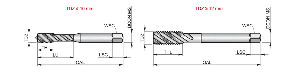 Метчик со спиральной канавкой и фаской формы C, с шагом 2-3xP, для метрической резьбы ISO M5 с шагом 0,80 мм и классом точности 6H, размеры по стандарту ISO 529, с хвостовиком 5,0 мм и квадратным приводом 4,0 мм, из порошковой стали HSS-E с покрытием TiN и углом наклона винтовой линии 45° для нарезания резьбы в глухих отверстиях диаметром 2,5xD в автоматической обработке на станке, из обычной углеродистой и легированной стали, ферритной, мартенситной и аустенитной нержавеющей стали и литого алюминия.