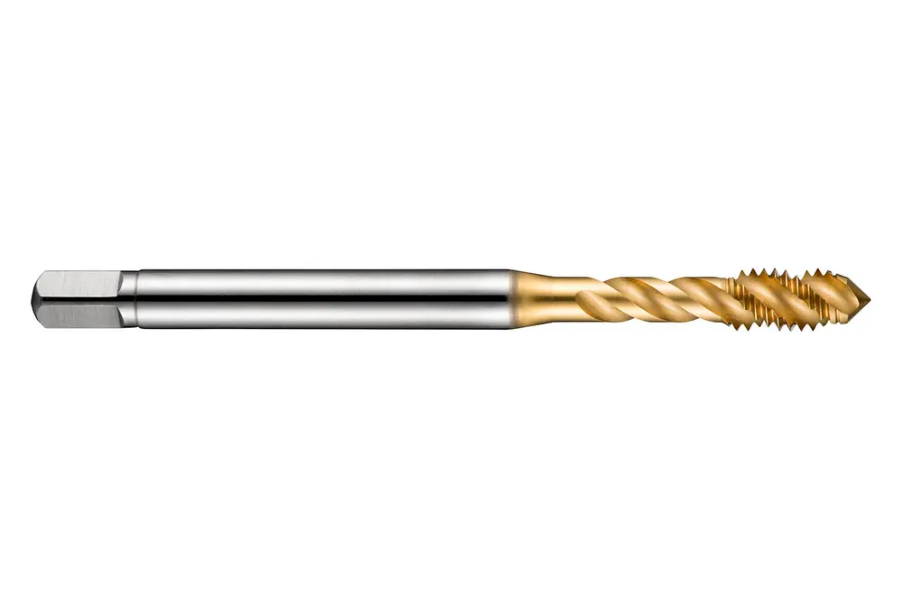 Метчик со спиральной канавкой и фаской формы C, с шагом 2-3xP, для метрической резьбы ISO M8 с шагом 1,25 мм и классом точности 6H, размеры по стандарту ISO 529, с хвостовиком 8,0 мм и квадратным приводом 6,3 мм, из порошковой стали HSS-E с покрытием TiN и углом наклона винтовой линии 45° для нарезания резьбы в глухих отверстиях диаметром 2,5xD при обработке на станке с ЧПУ, из обычной углеродистой и легированной стали, ферритной, мартенситной и аустенитной нержавеющей стали и литого алюминия.