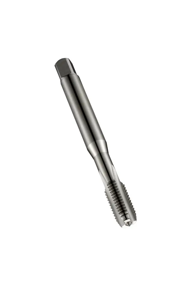 Метчик с прямой канавкой и фаской формы C, с шагом 2-3xP, для метрической резьбы ISO M6 с шагом 1,00 мм и классом точности 6H, размеры по стандарту DIN 371, с хвостовиком 6,0 мм и квадратным приводом 4,9 мм, из порошковой металлургии HSS-E с блестящей отделкой для нарезания сквозной или глухой резьбы 1,5xD в станках с ЧПУ и из обычной углеродистой стали.