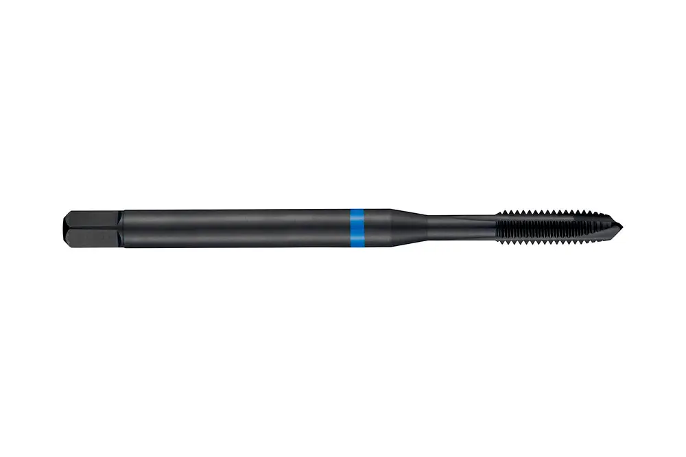 Метчик со спиральной головкой Blue Shark с фаской формы B, вторым заходом 3,5-5xP, для метрической резьбы ISO M16 с шагом 2,00 мм и классом точности 6H, размеры по стандарту DIN 376, с хвостовиком 12,0 мм и квадратным приводом 9,0 мм, изготавливается из порошковой стали HSS-E с обработанной паром поверхностью для нарезания сквозной резьбы 2,5xD в нержавеющей стали.