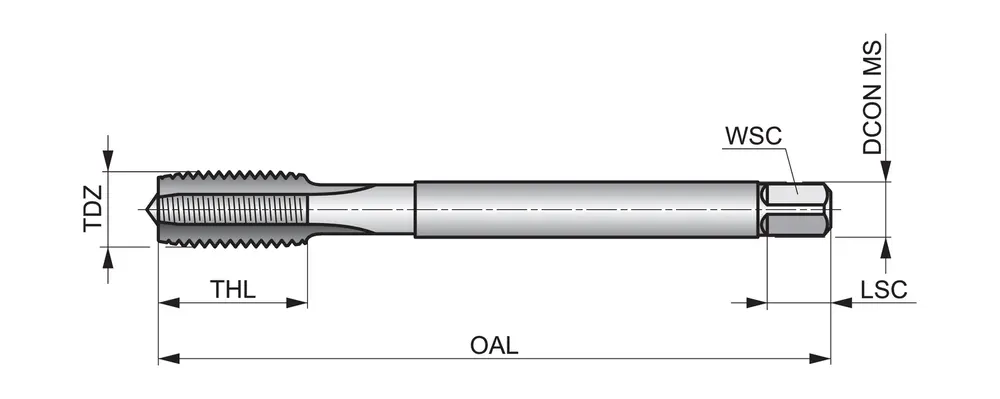 Метчик с прямой канавкой и фаской формы C, с шагом 2-3xP, для левой метрической резьбы ISO M16 с шагом 2,00 мм и классом точности 6H, размеры по стандарту DIN 376, с хвостовиком 12,0 мм и квадратным приводом 9,0 мм, из порошковой металлургии HSS-E с блестящей отделкой для нарезания сквозной или глухой резьбы 1,5xD в станках с ЧПУ и из обычной углеродистой стали.