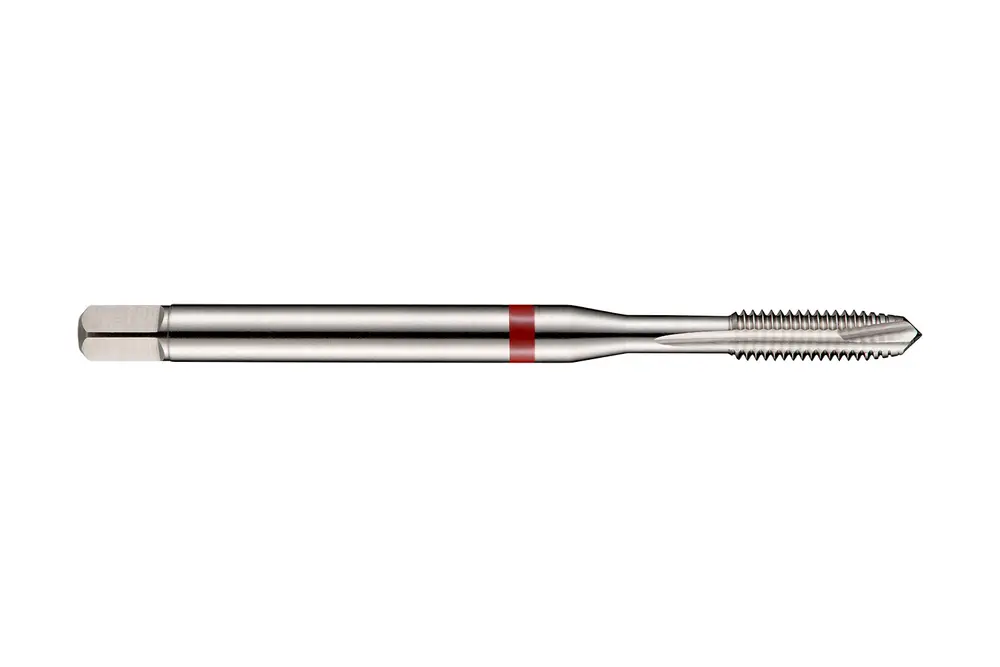 Метчик Red Shark со спиральной канавкой, фаской формы B, вторым заходом 3,5-5xP, для метрической резьбы ISO M6 с шагом 1,00 мм и классом точности 6H, размеры по стандарту DIN 371, с хвостовиком 6,0 мм и квадратным приводом 4,9 мм, из порошковой металлургии HSS-E с блестящей отделкой для нарезания сквозной резьбы 2,5xD в углеродистой, легированной и инструментальной стали.