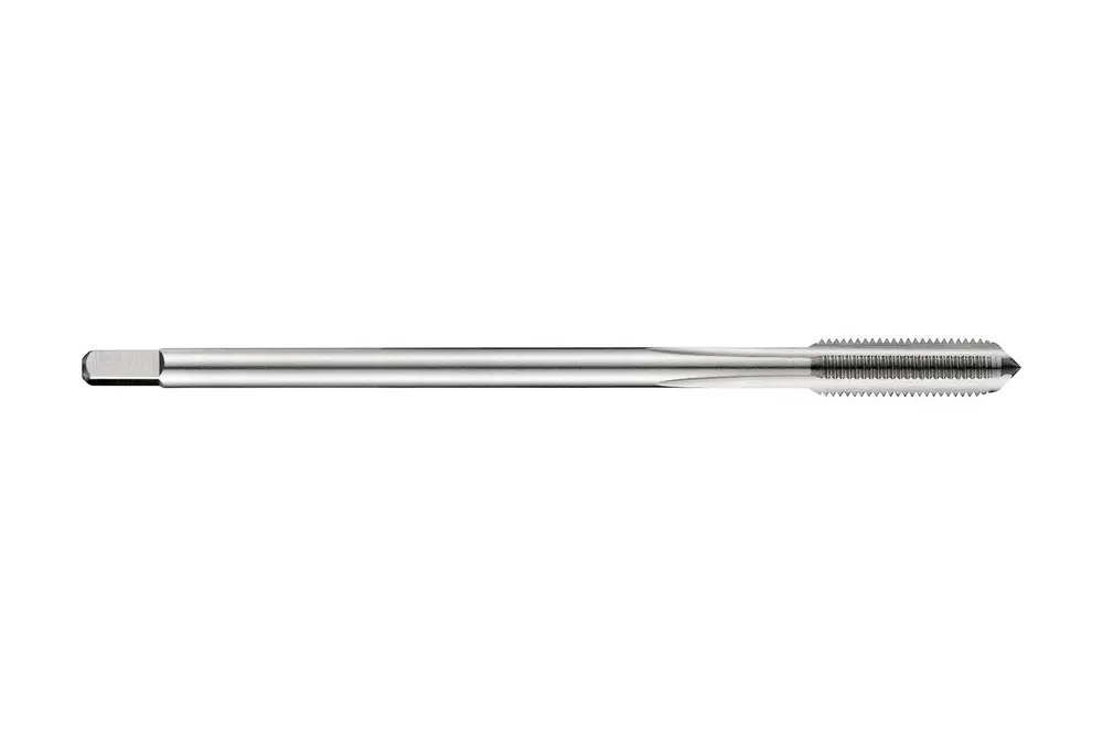 Метчик с прямой канавкой и фаской формы C, с шлицем 2-3xP, для левой метрической резьбы ISO M14 с шагом 1,00 мм и классом точности 6H, размеры по стандарту DIN 374, с хвостовиком 11,0 мм и квадратным приводом 9,0 мм, из порошковой металлургии HSS-E с блестящей отделкой для нарезания сквозной или глухой резьбы 1,5xD в станках с ЧПУ и в углеродистой стали.