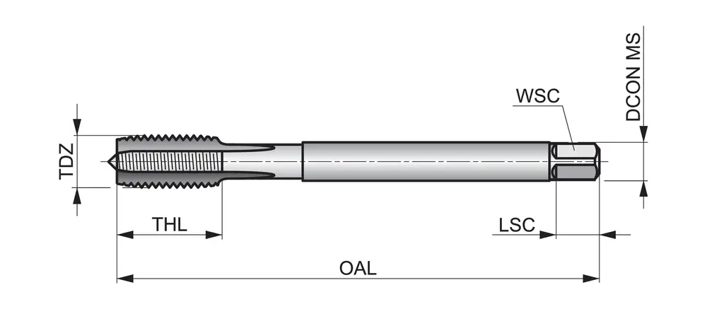 Метчик с прямой канавкой и фаской формы C, с шлицем 2-3xP, для левой метрической резьбы ISO M18 с шагом 1,50 мм и классом точности 6H, размеры по стандарту DIN 374, с хвостовиком 14,0 мм и квадратным приводом 11,0 мм, из порошковой металлургии HSS-E с блестящей отделкой для нарезания сквозной или глухой резьбы 1,5xD в станках с ЧПУ и в углеродистой стали.