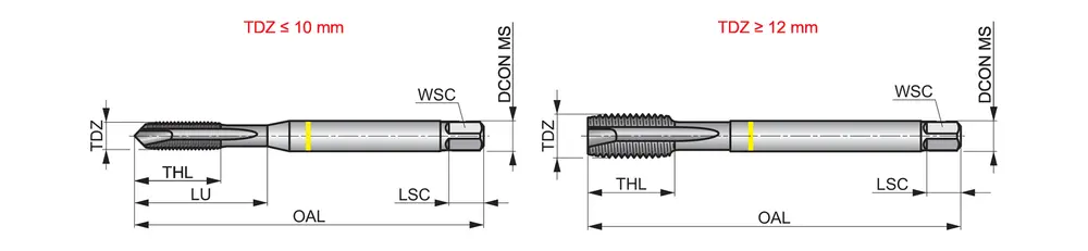 Метчик Yellow Shark со спиральной канавкой, фаской формы B, вторым заходом 3,5-5xP, для метрической резьбы ISO M14 с шагом 2,00 мм и классом точности 6H, размеры по стандарту DIN 376, с хвостовиком 11,0 мм и квадратным приводом 9,0 мм, изготавливается из порошковой стали HSS-E с блестящей хромированной поверхностью для нарезания резьбы 2,5xD в сквозных отверстиях из стали, обработанной на станке, и углеродистой стали, меди или медных сплавов.