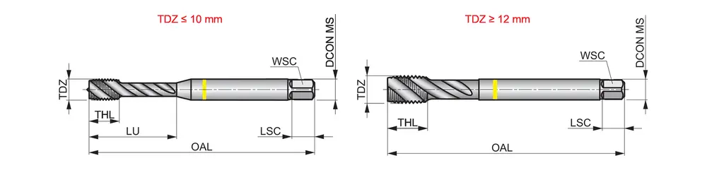Метчик со спиральной канавкой Yellow Shark с фаской формы C, с направляющей втулкой 2-3xP, для метрической резьбы ISO M10 с шагом 1,50 мм и классом точности 6H, размеры по стандарту DIN 371 с хвостовиком 10,0 мм и квадратным приводом 8,0 мм, из порошковой стали HSS-E с блестящей хромированной поверхностью и углом наклона винтовой линии 40° для нарезания резьбы в глухих отверстиях 2xD в стали с автоматической и обычной обработкой на станке, а также в углеродистой стали и меди или медных сплавах.