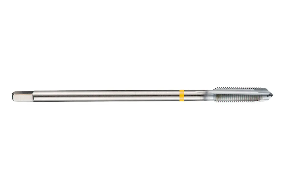 Метчик Yellow Shark со спиральной канавкой, фаской формы B, вторым заходом 3,5-5xP, для метрической мелкой резьбы ISO M14 с шагом 1,50 мм и классом точности 6H, размеры по стандарту DIN 374, с хвостовиком 11,0 мм и квадратным приводом 9,0 мм, из порошковой металлургии HSS-E с блестящей хромированной поверхностью для нарезания резьбы 2,5xD в сквозных отверстиях из стали, обработанной на станке, и обычной углеродистой стали, меди или медных сплавов.