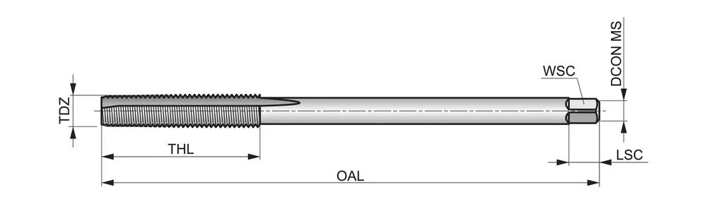 Метчик гаечный с прямой канавкой и удлиненным конусом 18-20xP для метрической резьбы ISO M10 с шагом 1,50 мм и классом точности 6H, размеры по стандарту DIN 357 с хвостовиком 7,0 мм и квадратным приводом 5,5 мм, из быстрорежущей стали HSS-E на основе кобальта с блестящей отделкой для нарезания сквозной или глухой резьбы 2xD в легкообрабатываемой стали