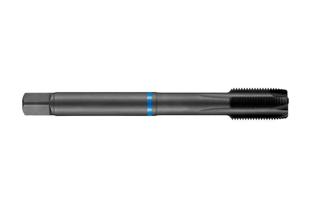 Метчик со спиральной головкой Blue Shark с фаской формы B, вторым заходом 3,5-5xP, для метрической мелкой резьбы ISO M12 с шагом 1,00 мм и классом точности 6H, размеры по стандарту DIN 374, с хвостовиком 9,0 мм и квадратным приводом 7,0 мм, изготавливается из порошковой стали HSS-E с обработанной паром поверхностью для нарезания сквозной резьбы 2,5xD в нержавеющей стали.